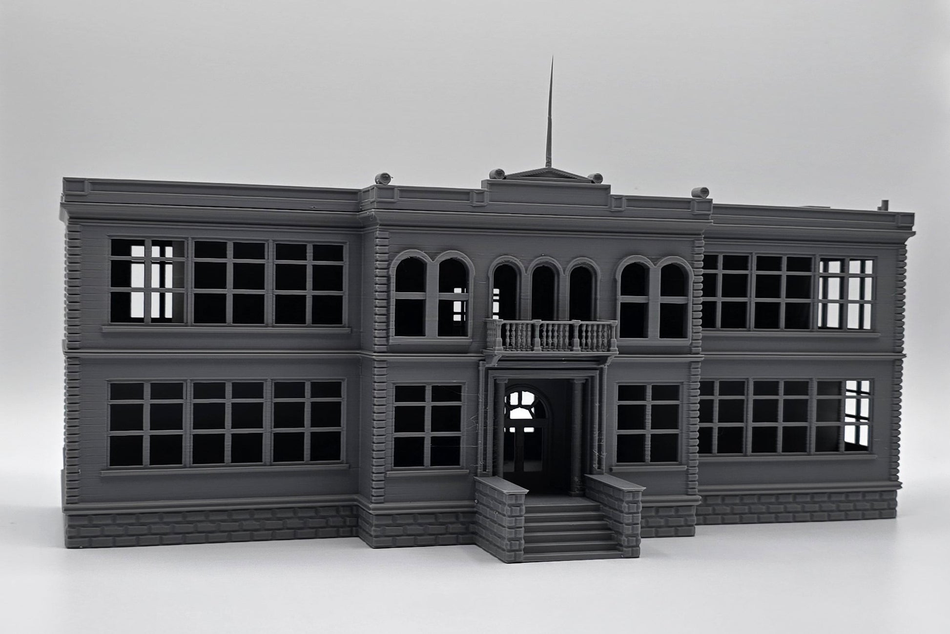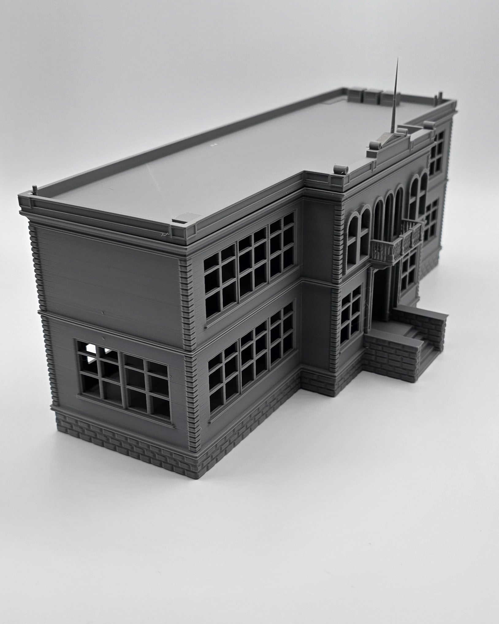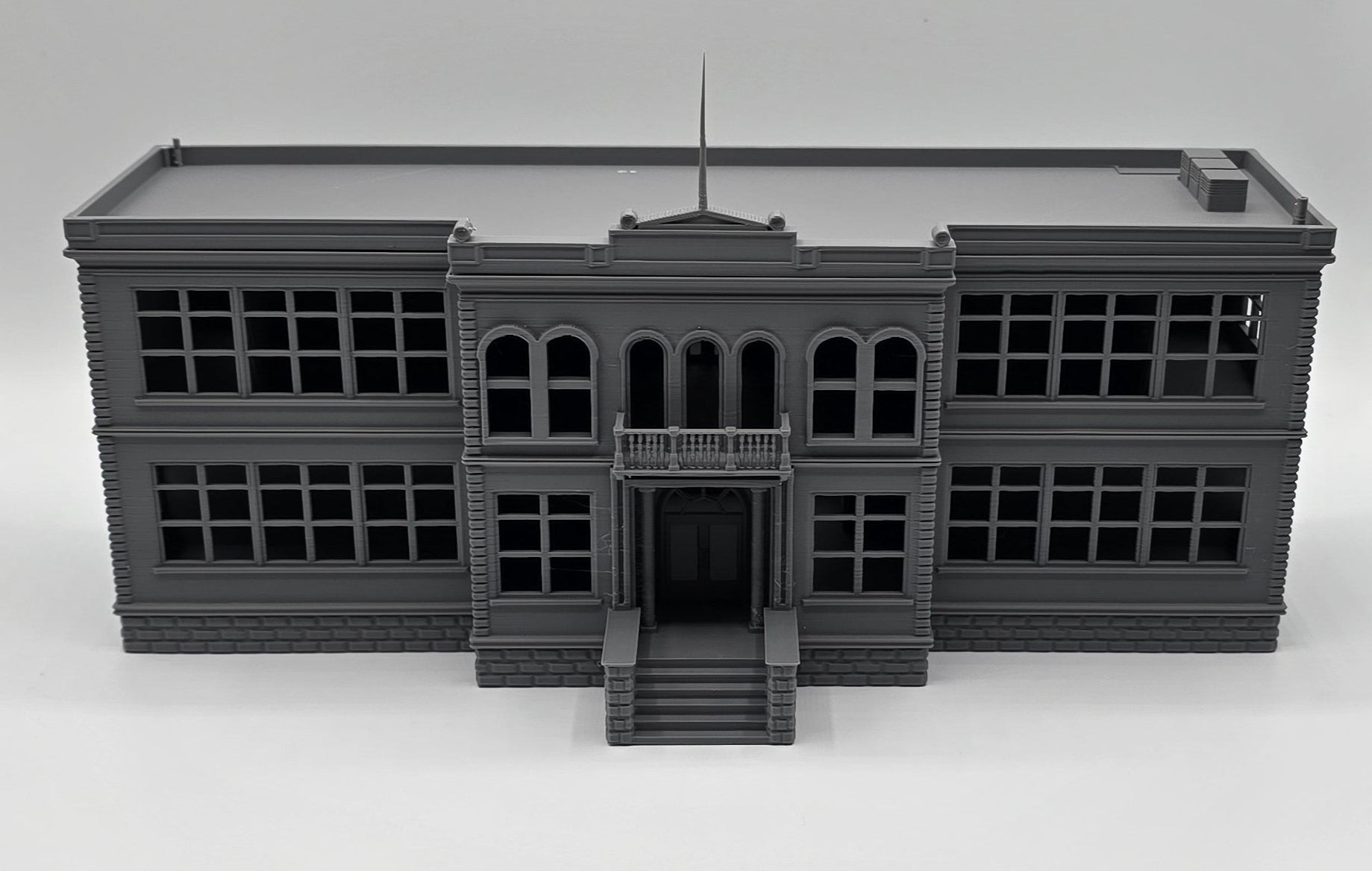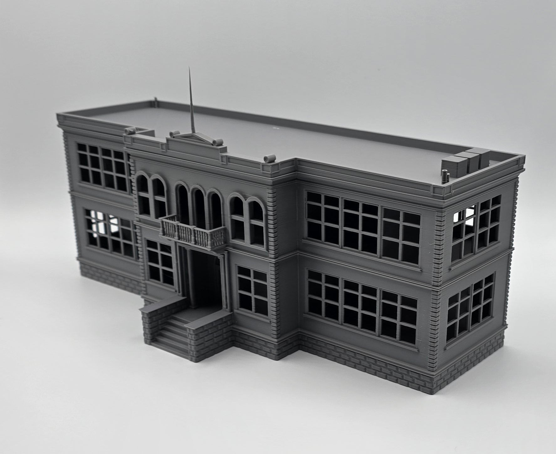 Detailed 3D-printed HO scale school building with large windows, stone-textured base, and a decorative front entrance. Great centerpiece for any town or city scene.
