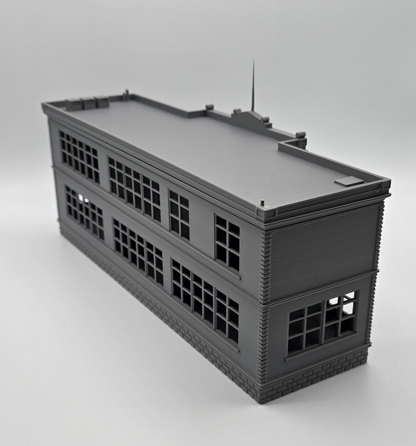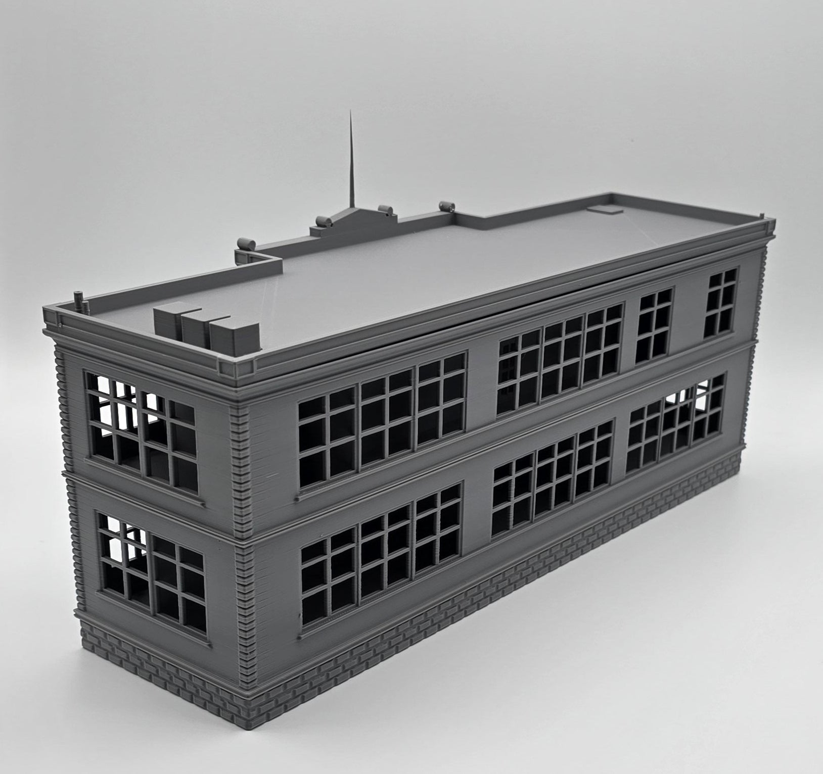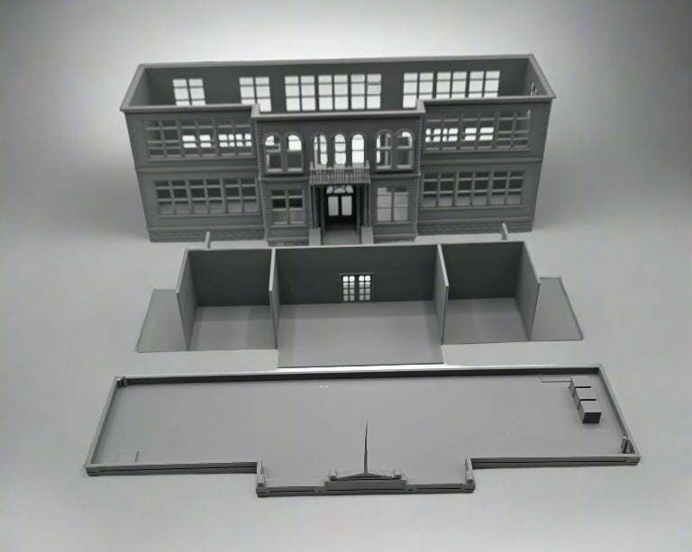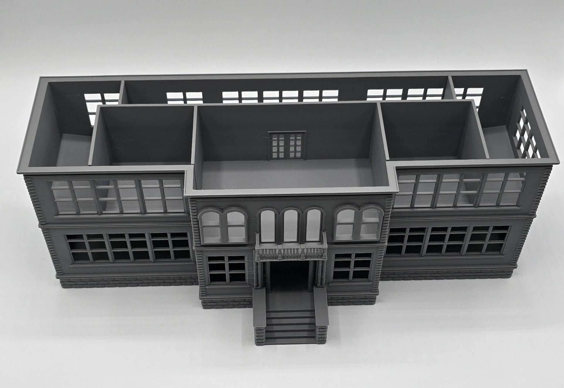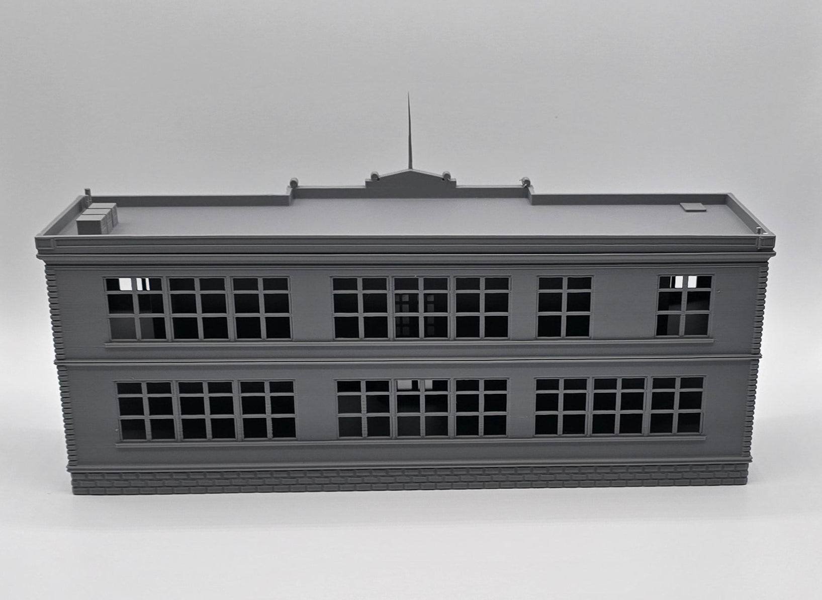 Detailed 3D-printed HO scale school building with large windows, stone-textured base, and a decorative front entrance. Great centerpiece for any town or city scene.