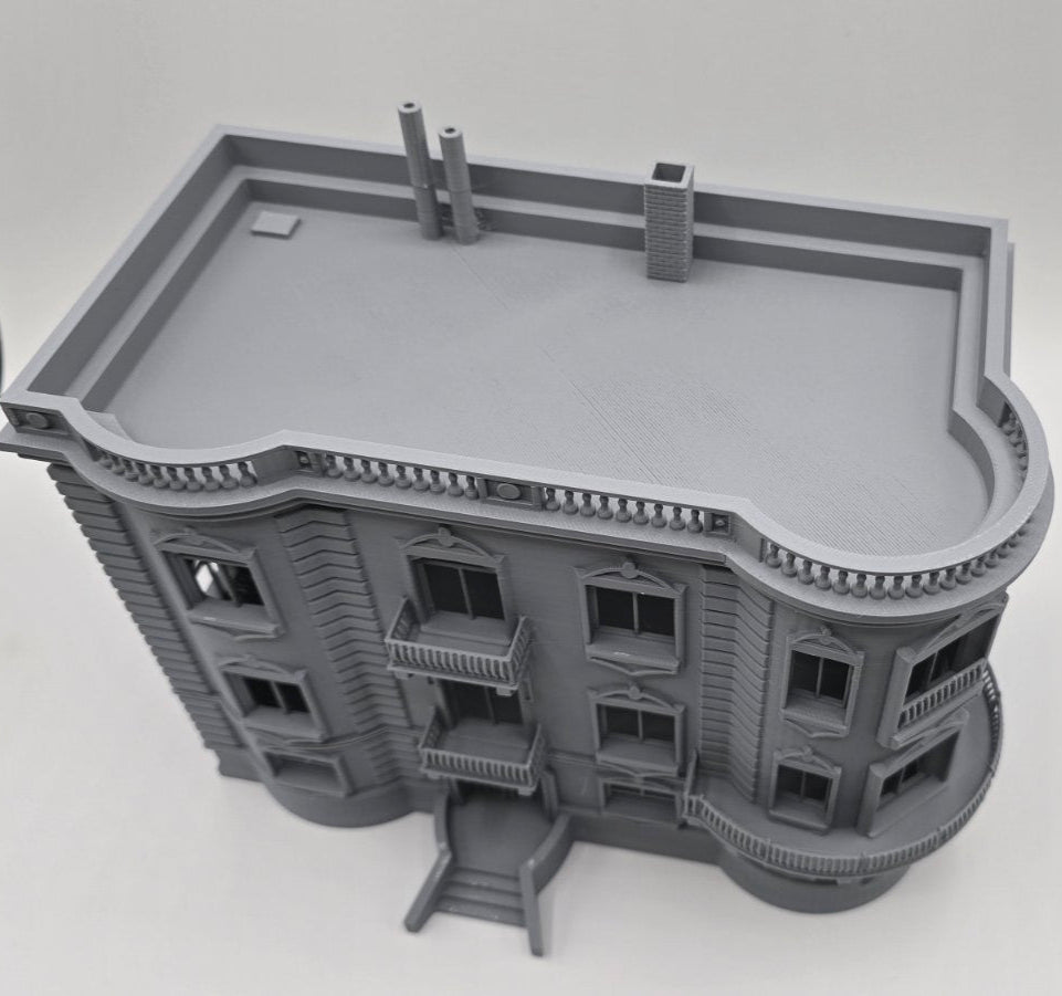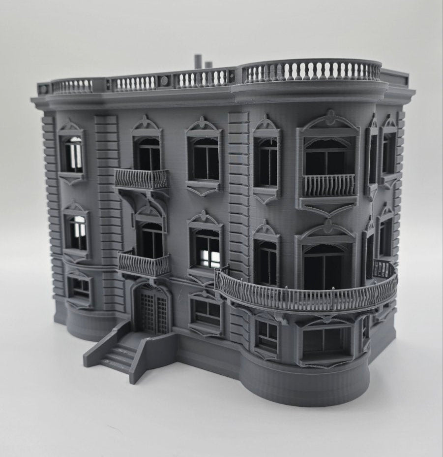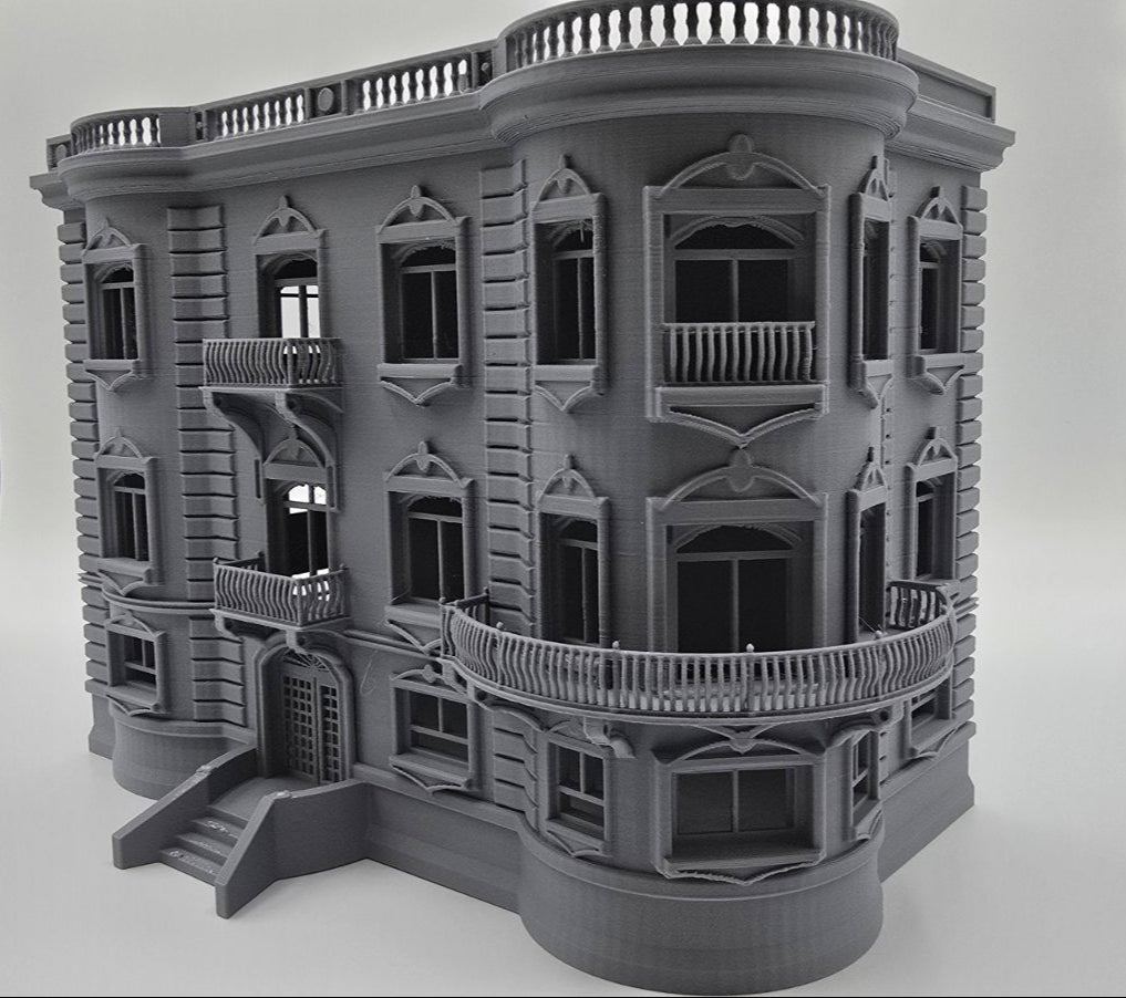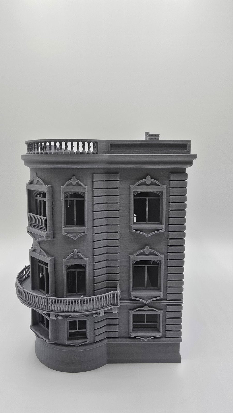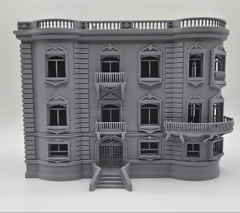 Bring the elegance of the Gilded Age to your model railroad or diorama with this highly detailed Ho scale 3D-printed building. Inspired by late 19th century urban architecture, this structure features intricate facades, ornate window frames, balconies, and a grand entrance.