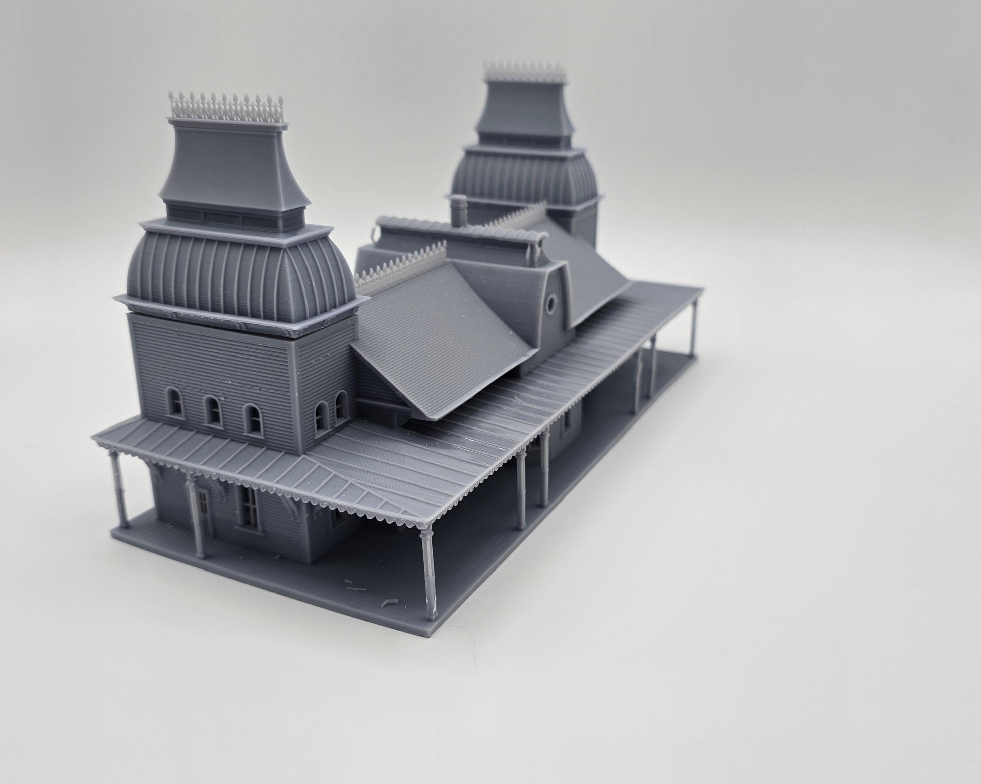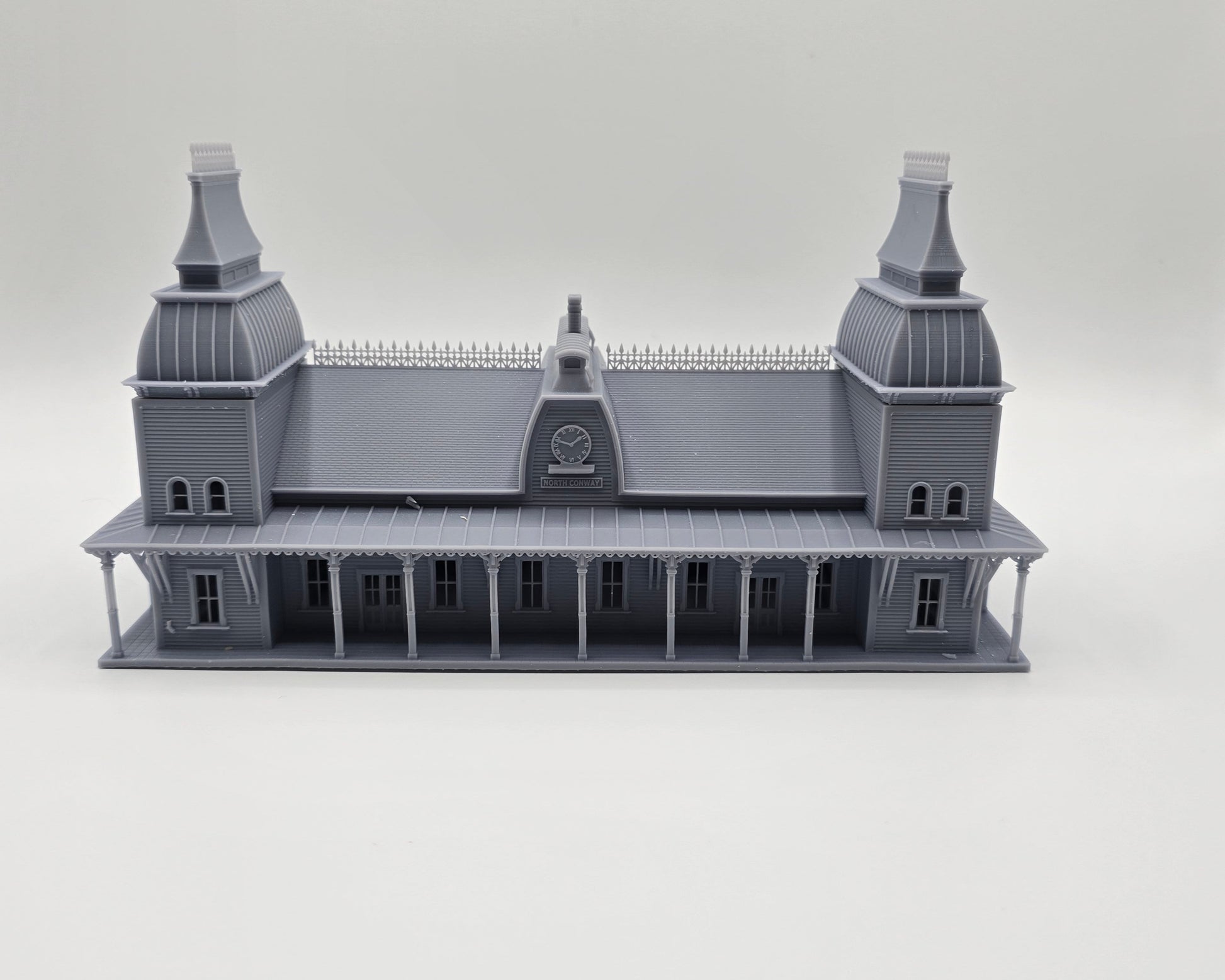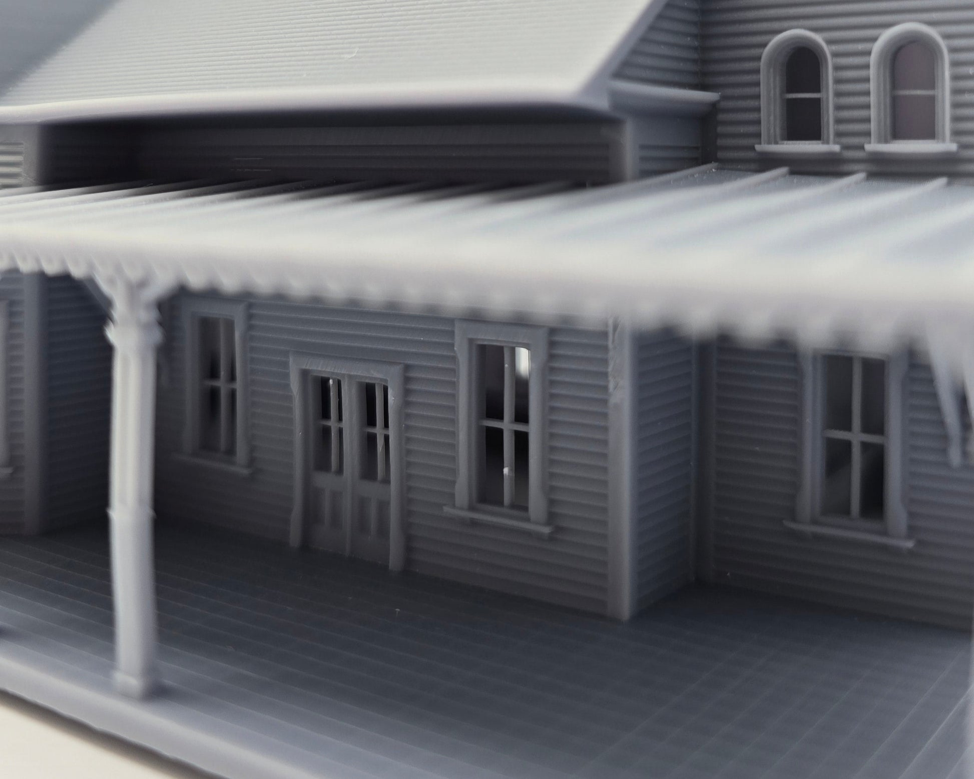 This is a high-detail N scale model of the North Conway Station, featuring intricate architectural elements that capture the essence of the historic railway station.