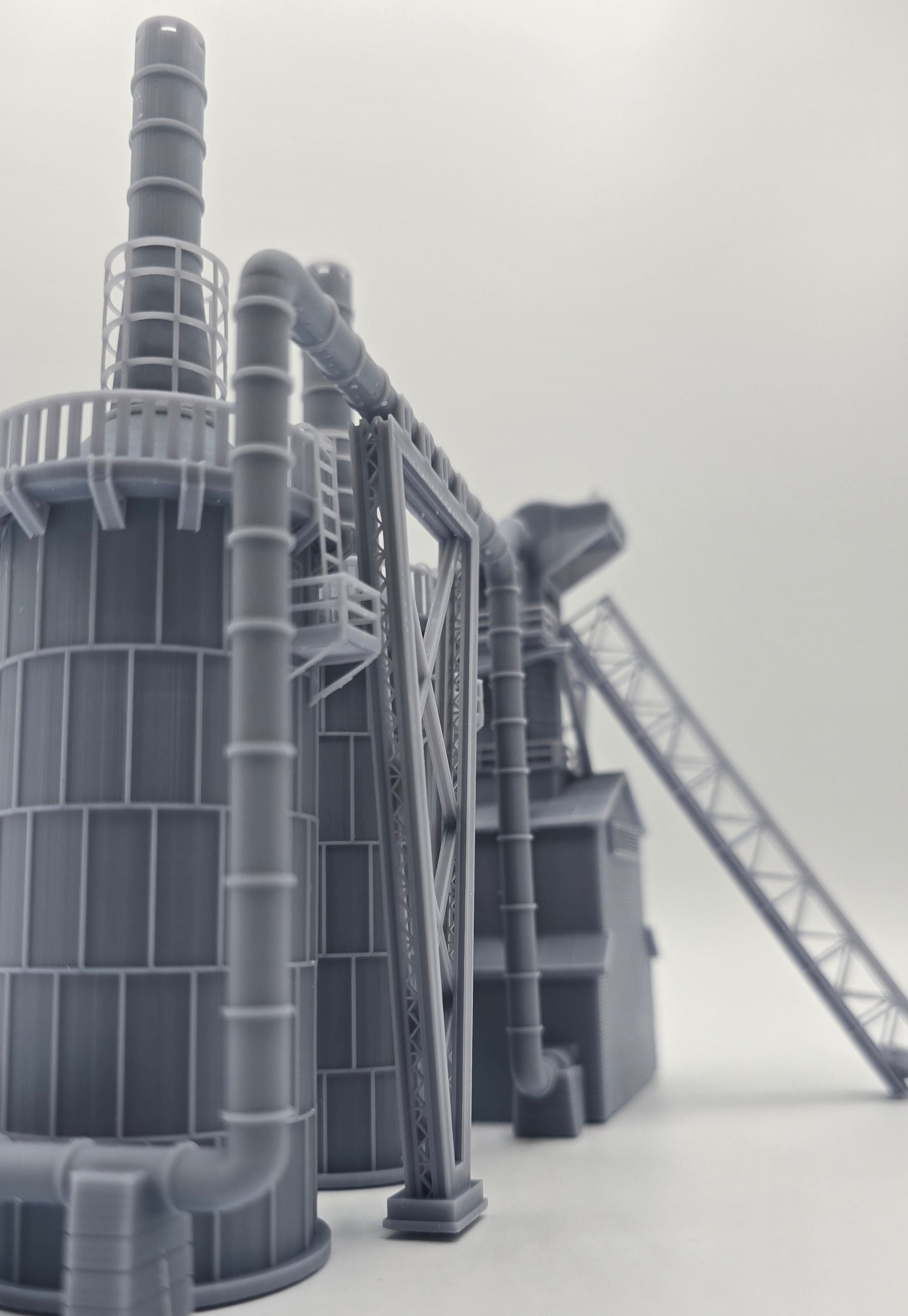 This N scale steel mill is a highly detailed industrial structure, perfect for adding realism to a heavy industry-themed layout. The model features complex piping, towering smokestacks, and intricate platform structures to replicate the look of a working steel production facility.